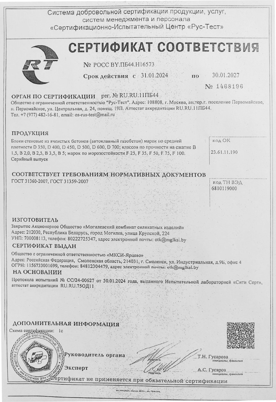 Плотность газобетонного блока обозначается буквой D и числом, которое указывает на среднюю плотность материала в кг/м³. Газобетон Могилевский КСИ D300 имеет плотность 300 кг/м³, что обеспечивает ему отличные теплоизоляционные свойства.